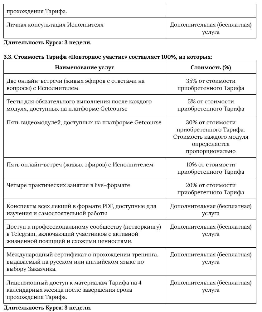 2.4. Каждый модуль и/или элемент Курса является отдельной информационно-консультационной услугой, которая может предоставляться и приниматься самостоятельно и независимо от иных модулей. Исполнитель вправе изменять порядок и сроки доступа к материалам, не ухудшая общего объема услуг по тарифу, выбранному Заказчиком.
