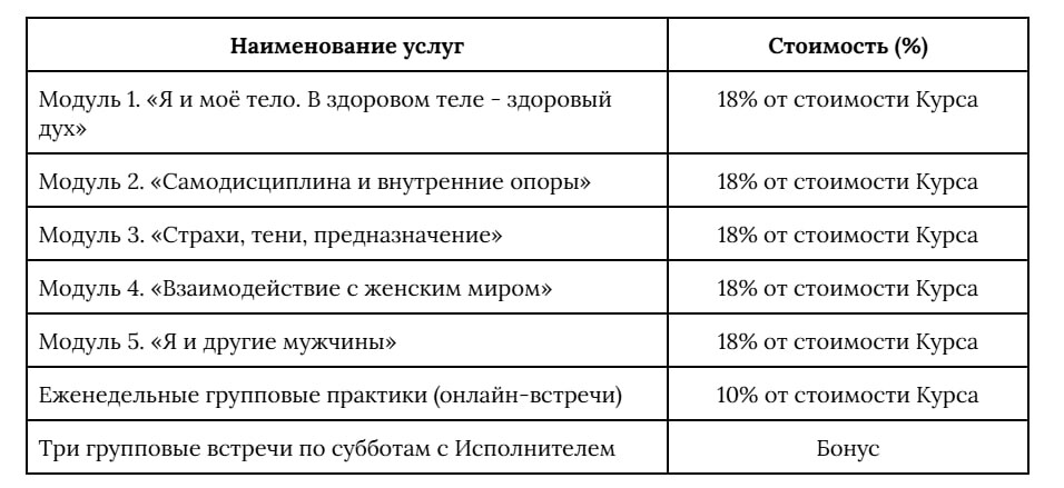 Стоимость комплекса информационных материалов и услуг в рамках Курса составляет 20 000 (Двадцать тысяч) рублей.