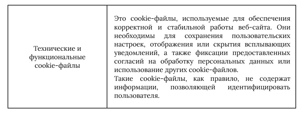 6.1. Файлы cookie — это небольшие текстовые файлы, размещаемые на устройстве Субъекта персональных данных (пользователя) веб-сайтом Оператора или иными лицами от имени Оператора, которые позволяют сохранять информацию о действиях, предпочтениях и настройках пользователя при посещении веб-сайта.Cookie-файлы могут использоваться для обеспечения корректной работы сайта, анализа поведения пользователей, а также предоставления персонализированного контента и рекламы. В зависимости от своего содержания и назначения cookie-файлы могут являться как техническими данными, не относящимися к персональным данным, так и содержать информацию, относимую к персональным данным в соответствии с Федеральным законом от 27.07.2006 № 152-ФЗ «О персональных данных». Оператор использует как собственные cookie-файлы (устанавливаемые непосредственно веб-сайтом), так и сторонние (устанавливаемые третьими лицами с разрешения Оператора).